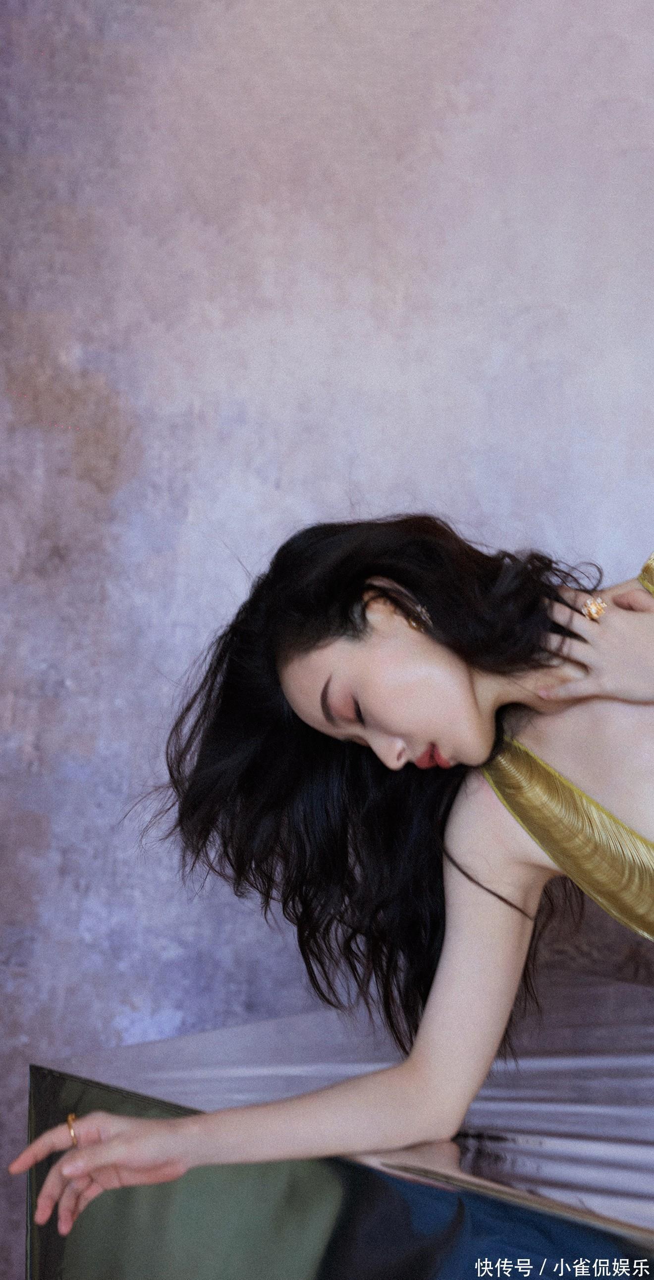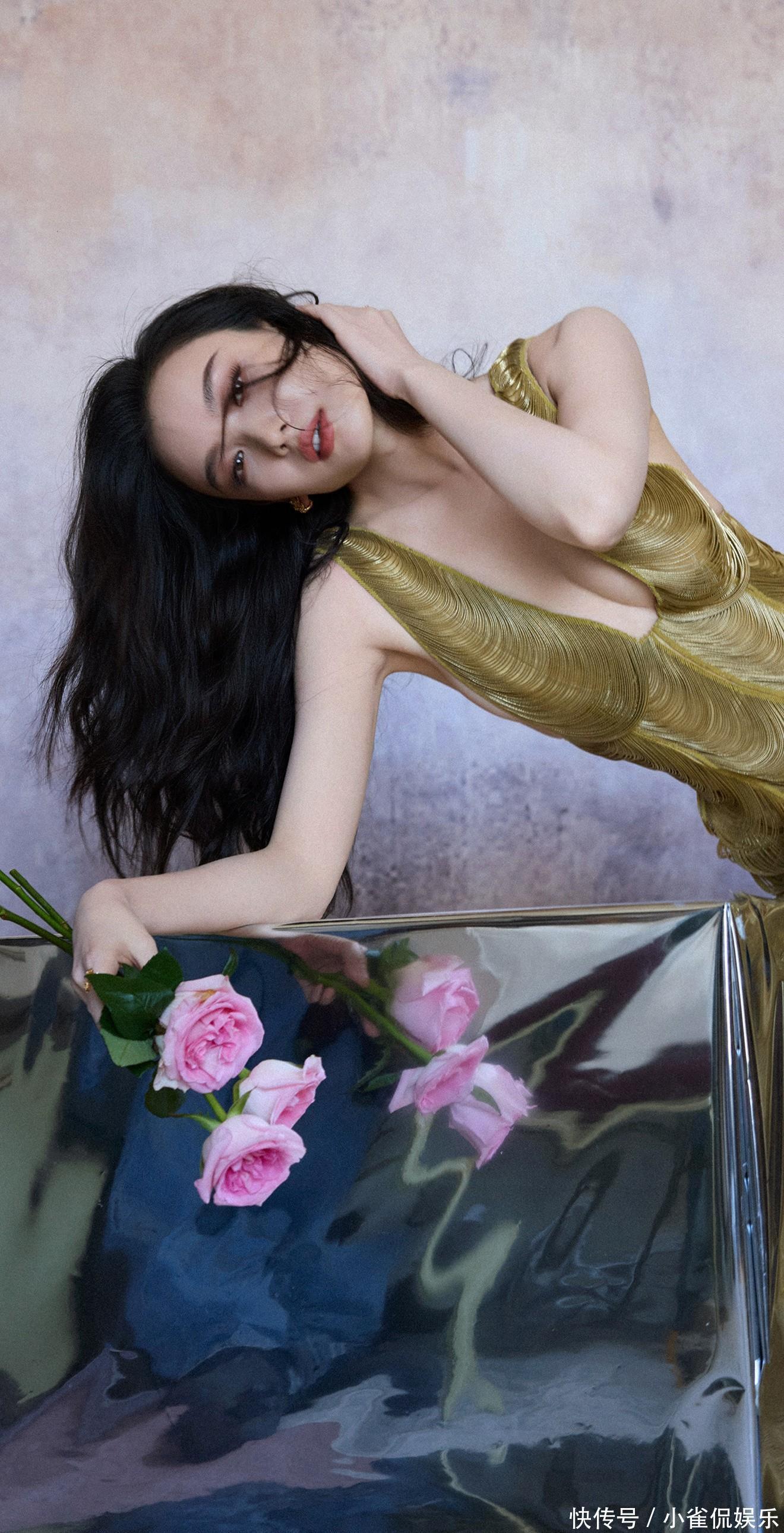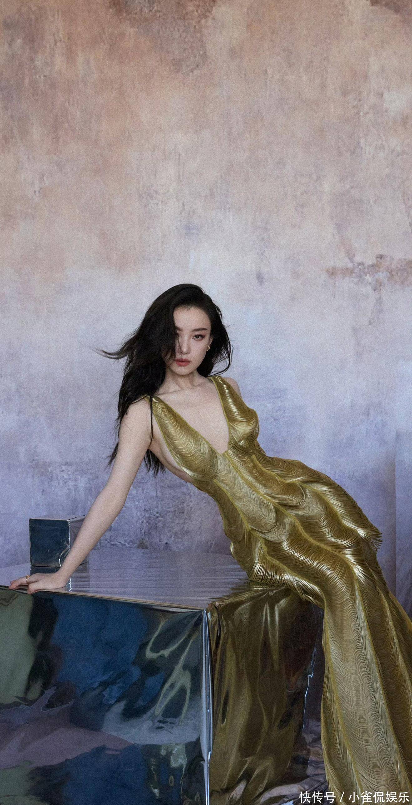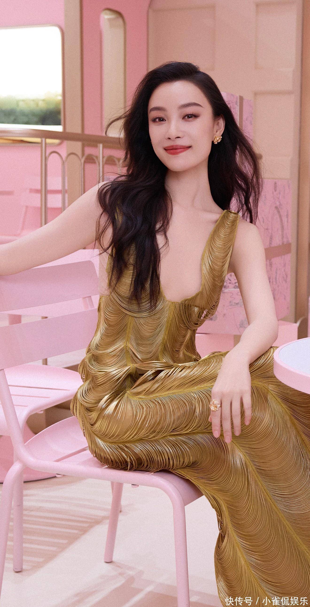 她倚在粉色桌椅旁浅笑时,卷发垂落肩头,鎏金裙摆拖出温柔的弧度,与背景的甜粉撞出奇妙的层次感;伏在镜面台面上的瞬间,发丝随风轻扬,眼底的清冷与礼裙的华丽相融,正如她对表演的理解:在明艳与沉静的切换里,赋予每个角色独有的灵魂。