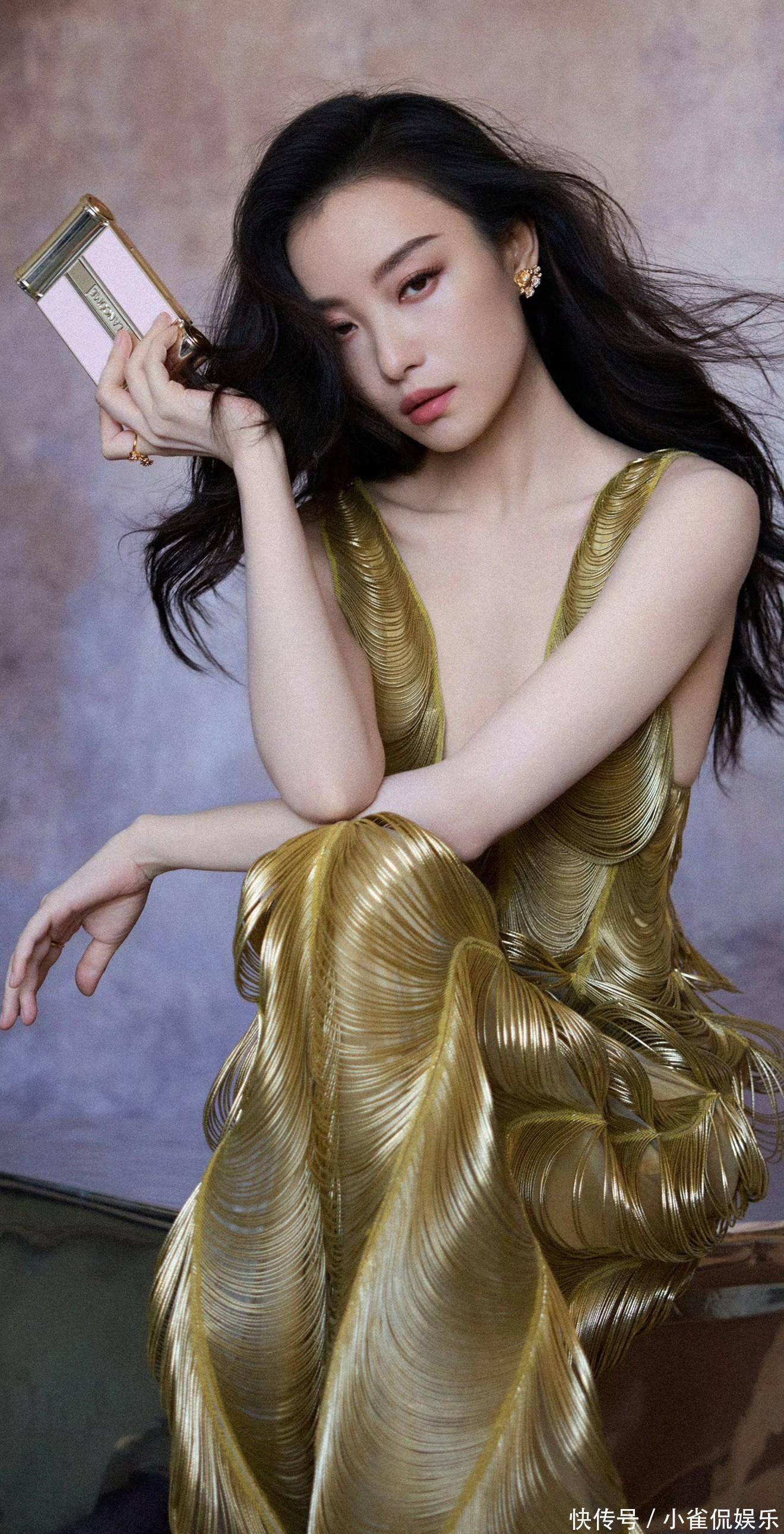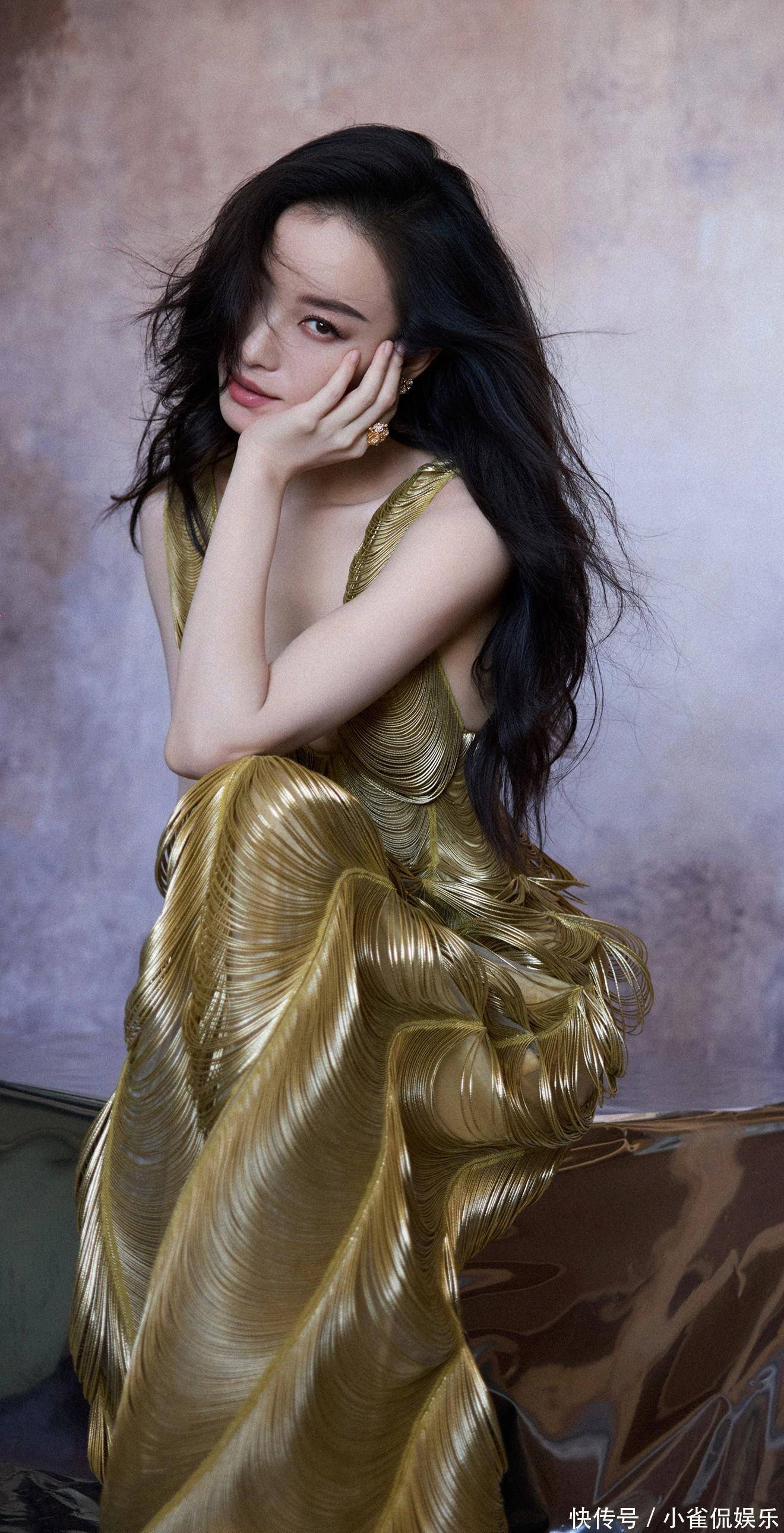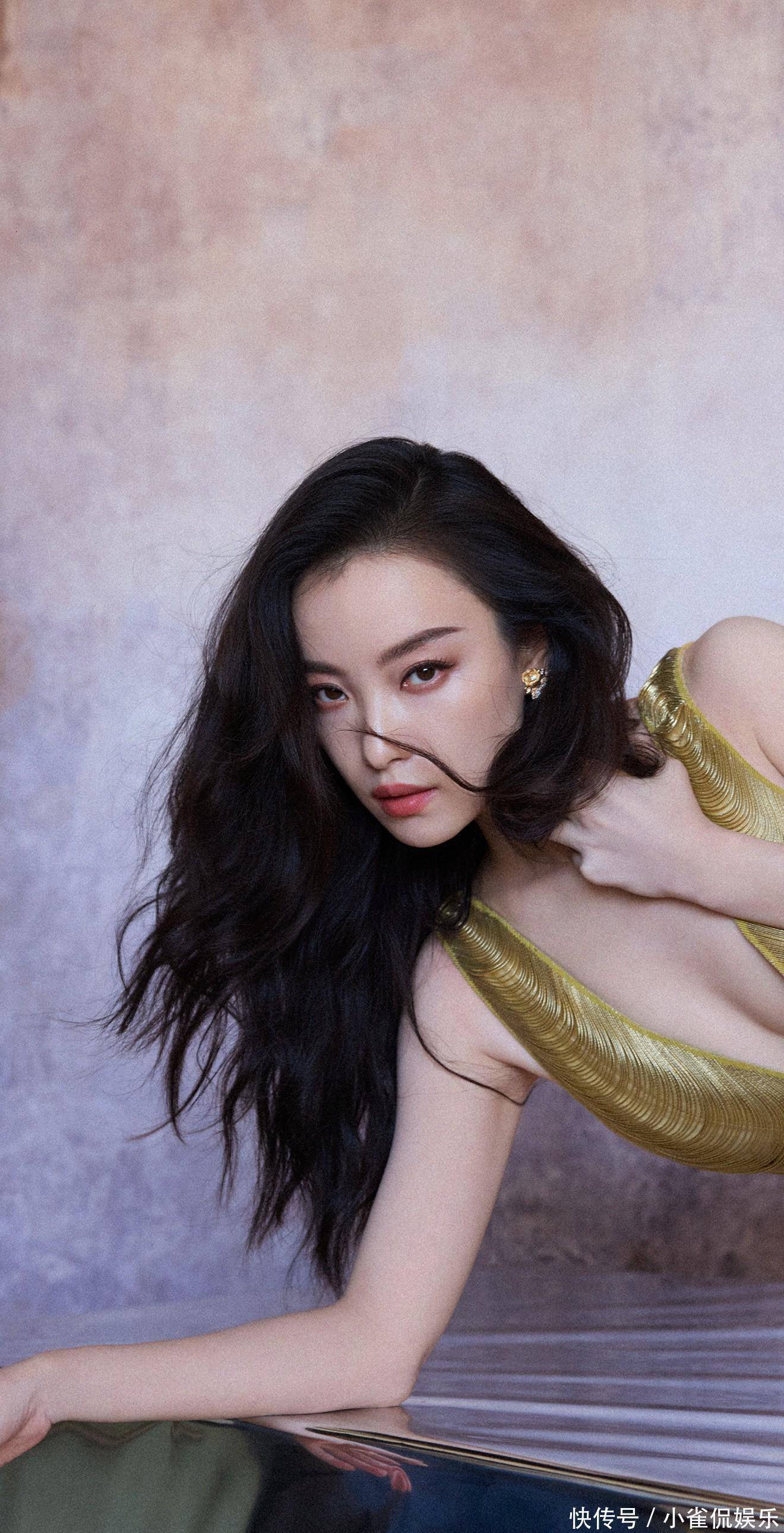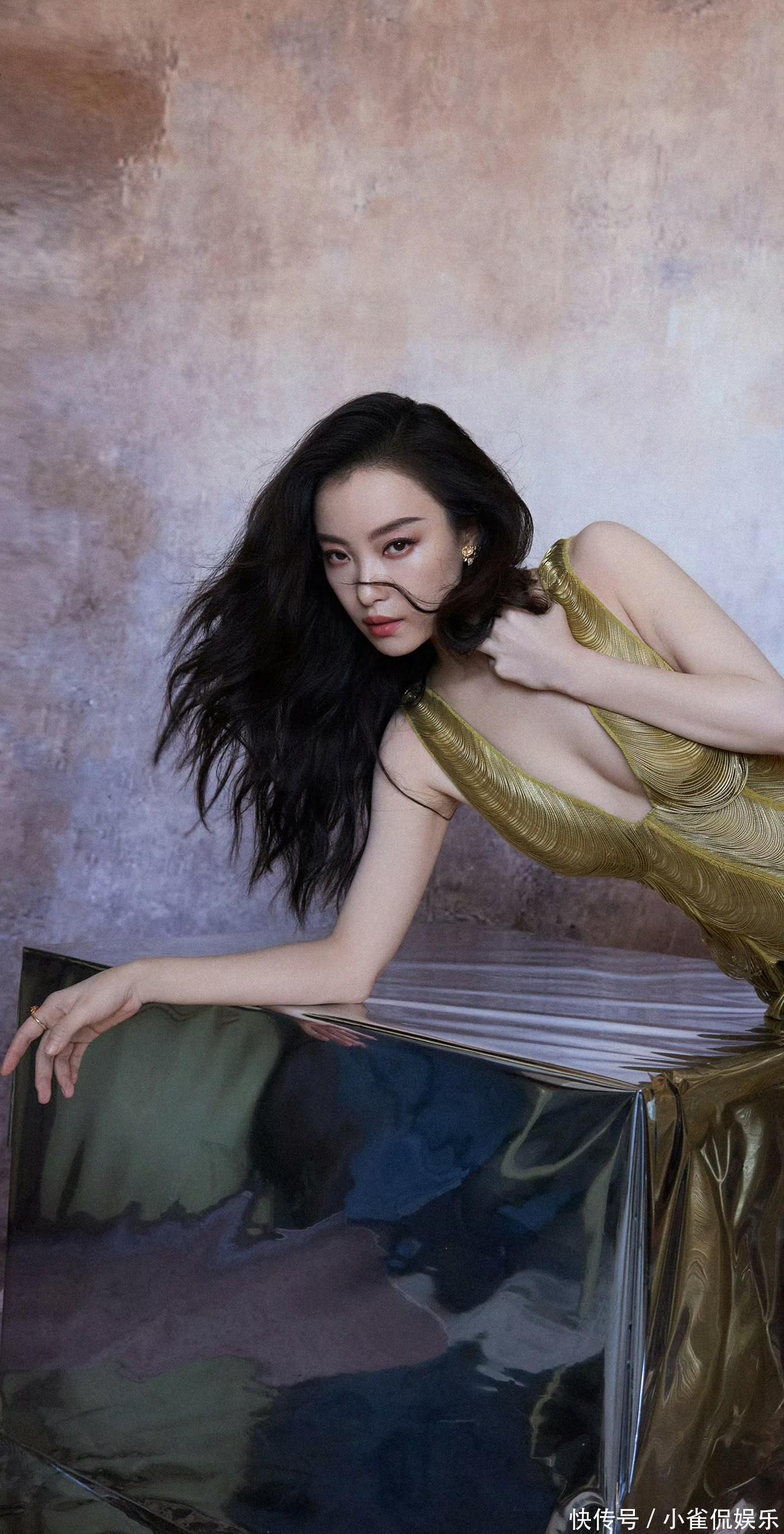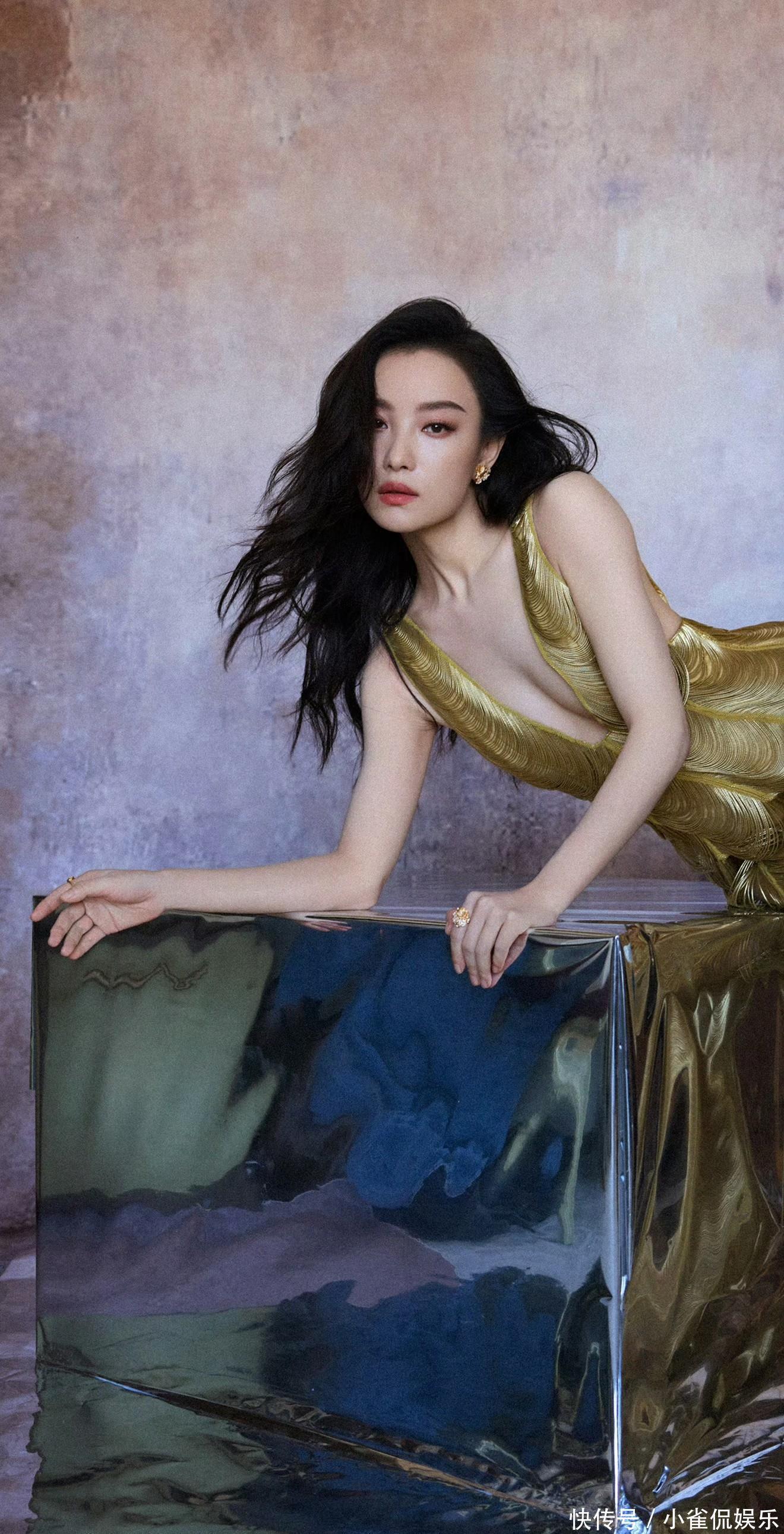 她倚在粉色桌椅旁浅笑时,卷发垂落肩头,鎏金裙摆拖出温柔的弧度,与背景的甜粉撞出奇妙的层次感;伏在镜面台面上的瞬间,发丝随风轻扬,眼底的清冷与礼裙的华丽相融,正如她对表演的理解:在明艳与沉静的切换里,赋予每个角色独有的灵魂。