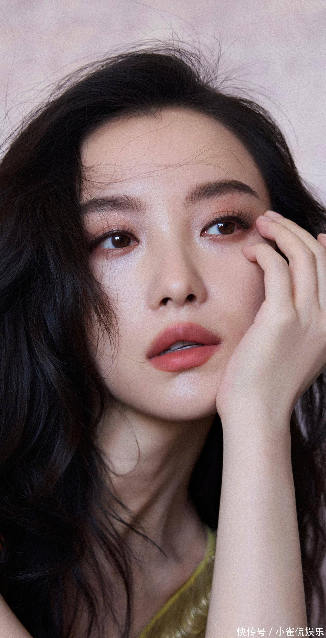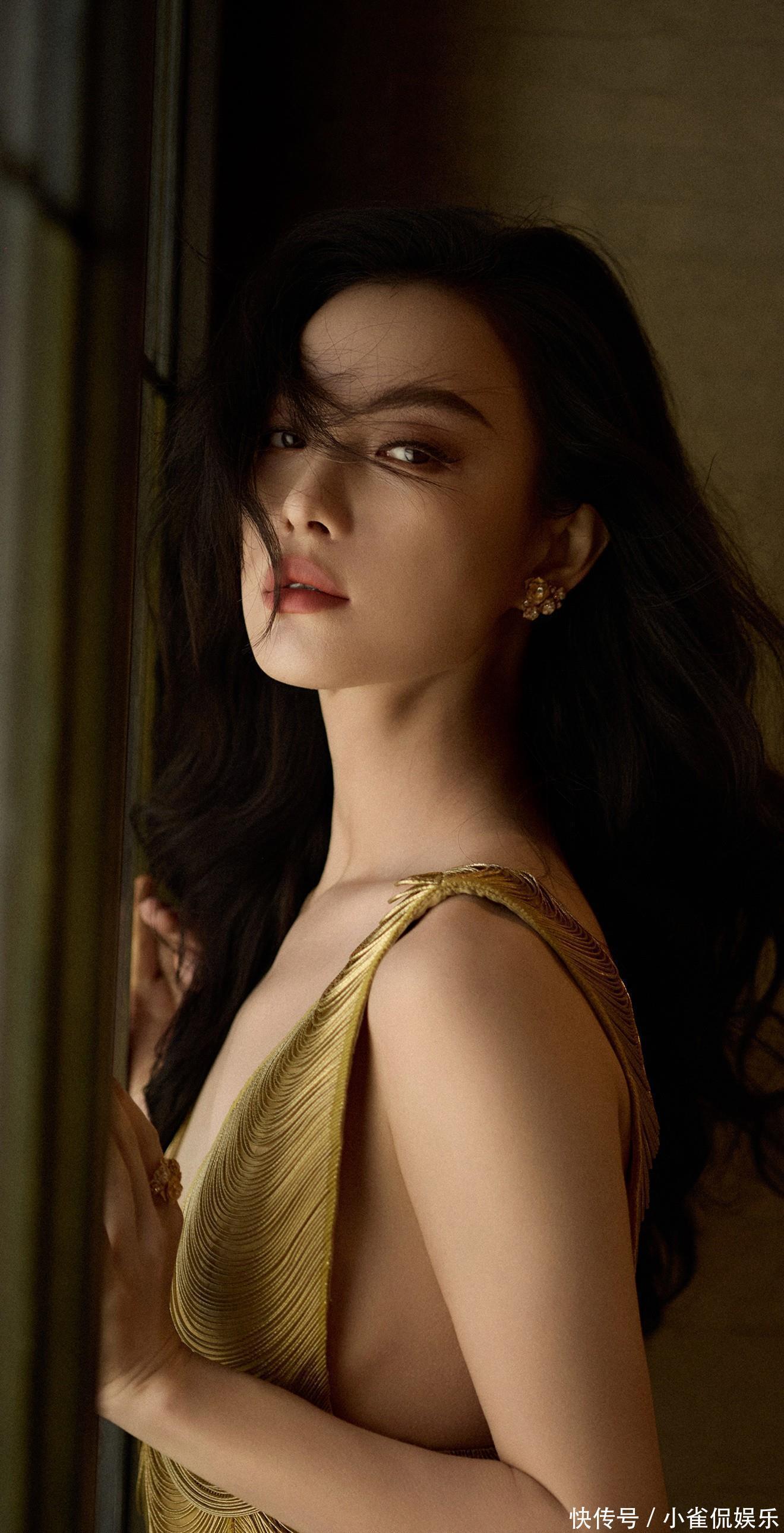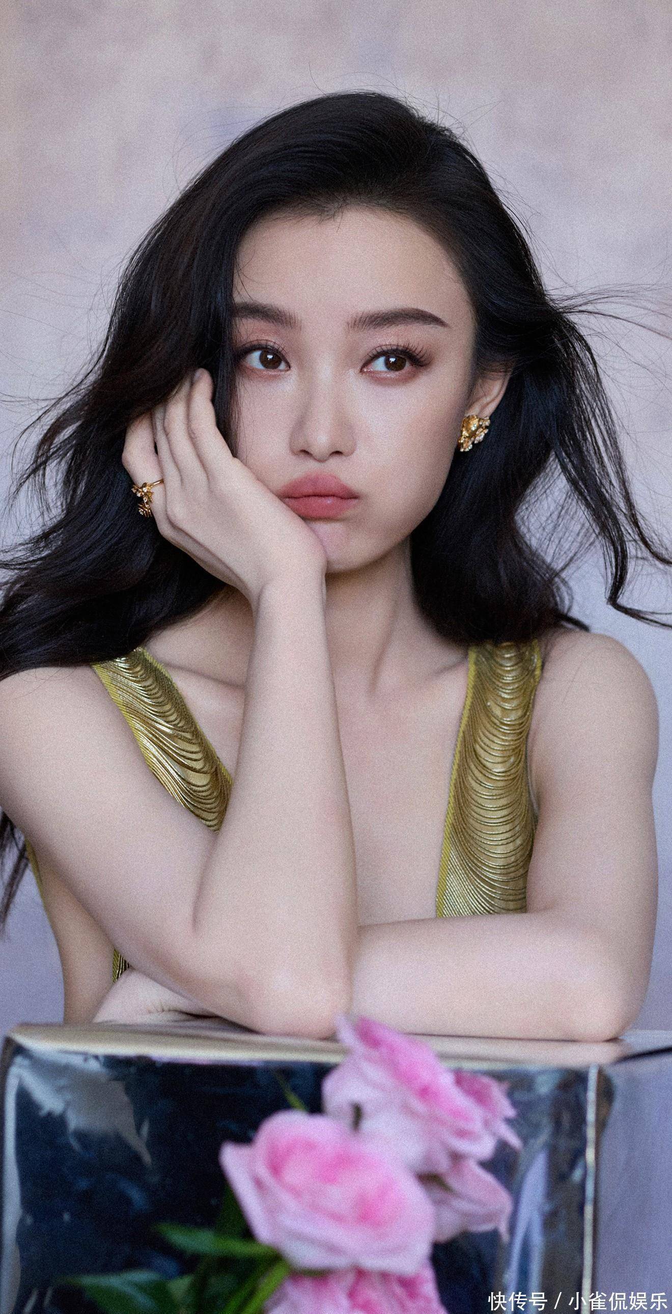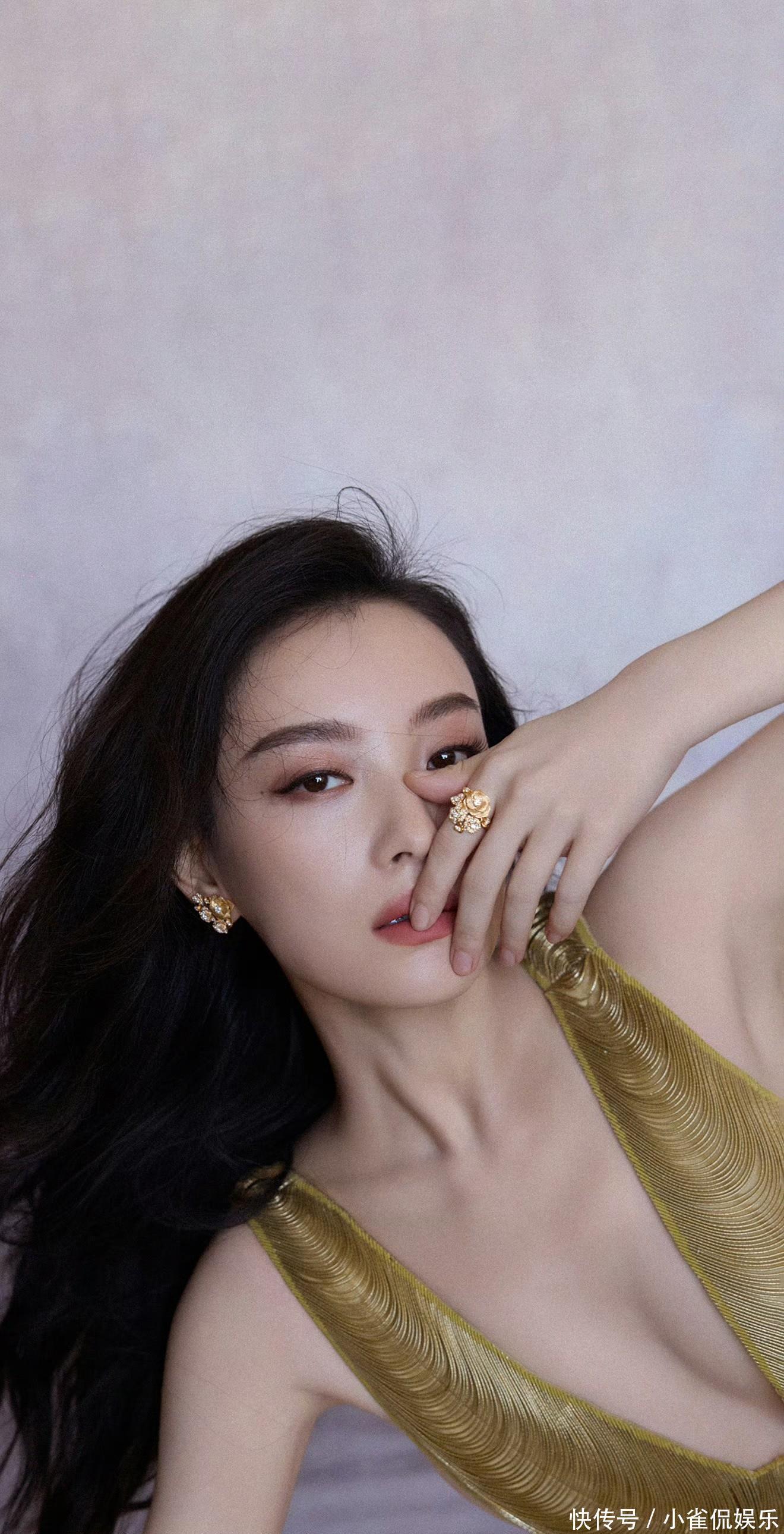 她倚在粉色桌椅旁浅笑时,卷发垂落肩头,鎏金裙摆拖出温柔的弧度,与背景的甜粉撞出奇妙的层次感;伏在镜面台面上的瞬间,发丝随风轻扬,眼底的清冷与礼裙的华丽相融,正如她对表演的理解:在明艳与沉静的切换里,赋予每个角色独有的灵魂。